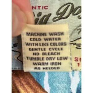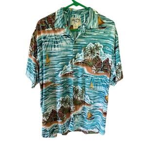Big Dog Hawaiian Shirt – Small Rayon Island Surf Print, Vintage Style Aloha Shirt Y2K authentic Big Dogs short sleeve Hawaiian shirt in a vibrant island print featuring sailboats, palm trees, waterfalls, and surf scenes with Big Dog characters. Made of soft 100% rayon for a relaxed tropical feel. Button front with a pointed collar and straight hem. Size: Small Shoulder: 22 inches Pit to Pit: 24.5 inches Length: 29.5 inches Made in Jordan Marked RN #64776 In excellent vintage condition with no flaws