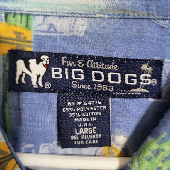 Big Dogs Mens SZ LG Hawaiian Button Down Shirt Tiki Palm Blue Good pre-owned condition. No holes or stains. Normal wear. See photos for details and approximate measurement.