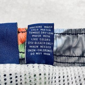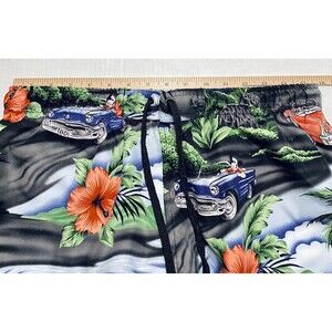 Vibrant swim trunks with tropical car and floral design. Features drawstring waist. Perfect for beach or pool.