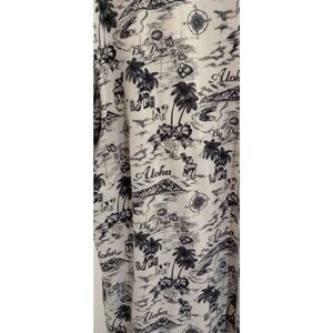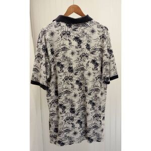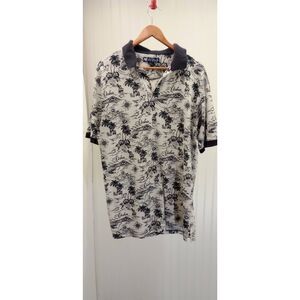Pre-owned vintage big dogs men's Hawaiian polo. Colors are dark blue and color and print cream background.