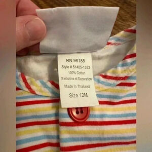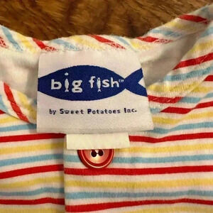 Big Fish by Sweet Potatoes Monkey Romper baby boy 12 months, adorable striped romper with colorful buttons. Snaps at bottom for easy diaper changes.