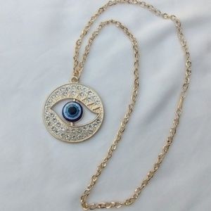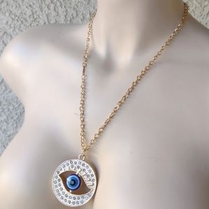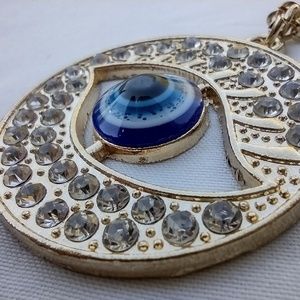 This is big & Garish Gold Tone & Rhinestone Studded Evil Eye Pendant on 20" Faux Chain.