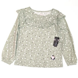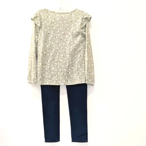 Girls First size 12, 2PC Jeans and Top Set. Light Green floral print long sleeve top with ruffle accent shoulders and neckline with elastic hem on sleeve and dark wash denim, light stretch 5 pocket jeans with flower embroidery on front left pocket and rear right pocket, belt loops, metal zipper and copper snap closure. Top 100% Cotton; Jeans 70% Cotton/29% Polyester/1% Spandex