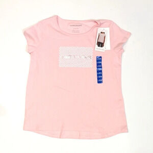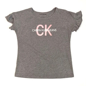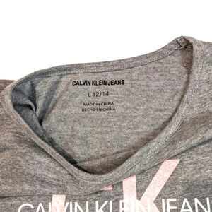 Big girls size L(12/14) Calvin Klein Jeans graphic tees, 2pcs: pink with metallic lettering, boxy body and uneven hem for comfy fit and grey with glitter CK signature logo on the front. Perfect for back to school! 60% Cotton/40% Polyester. New with Tags.