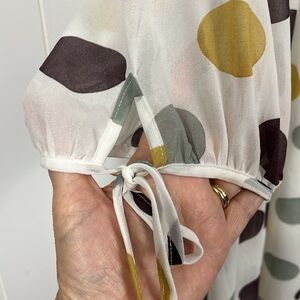 Big Hit Womens Mini Dress L Gold Gray Purple Polka Dot Pattern 1/2 Balloon Sleeves w/Ties Lined Square Neckline 100% Poly Full Skirt Lined Pretty Party EUC