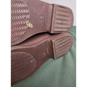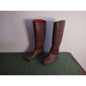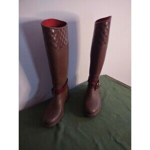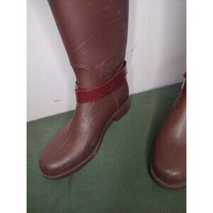 This is a pair of burgundy rubber boots they have a size 6 on the bottom I assume they are kids they might be women's they look similar to riding boots but I'm not positive if they're riding boots or rain boots there are some scuffs on them but overall good condition.