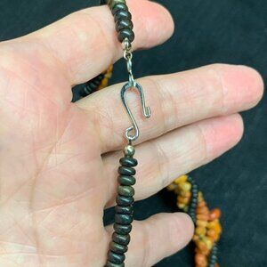 Lee Sands designed and made this big, gorgeous lion! He is spectacular and sure to be noticed and admired. Made with Apple Coral inlay and a topping of resin, the lion face is suspended by a multi-strand twisted necklace of stone chips in a red sand color with black disc-shape beads weaving throughout.