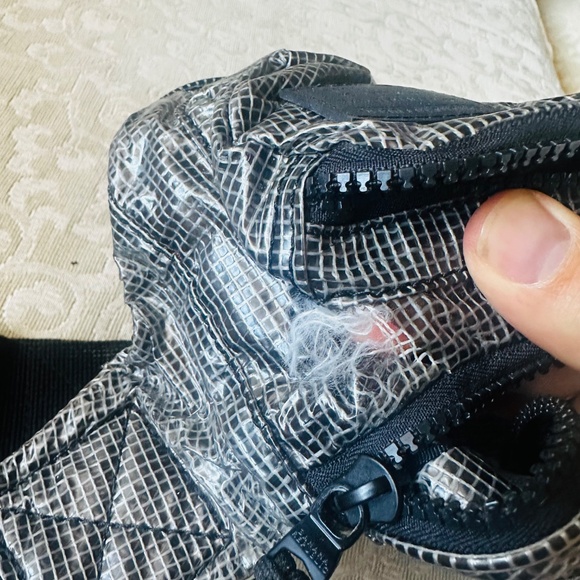 It’s in a fair condition! There’s a small rip on the side by the zipper. It has a plastic nylon material .