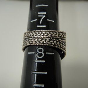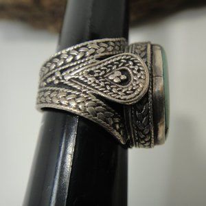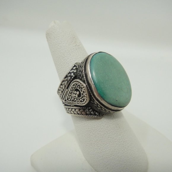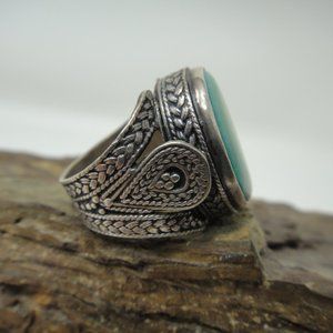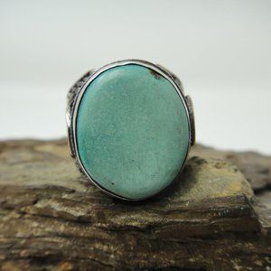 Big Southwestern Style Ring Green-Blue Stone Ornate Silver Tone Band 7.5
