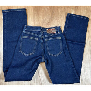 Features a mid-rise waist and dark wash denim. Classic five-pocket design with a zip fly and button closure. Minimalist style suitable for a cowgirl or basic casual look. Used - Good condition; minimal signs of wear.