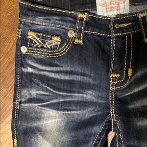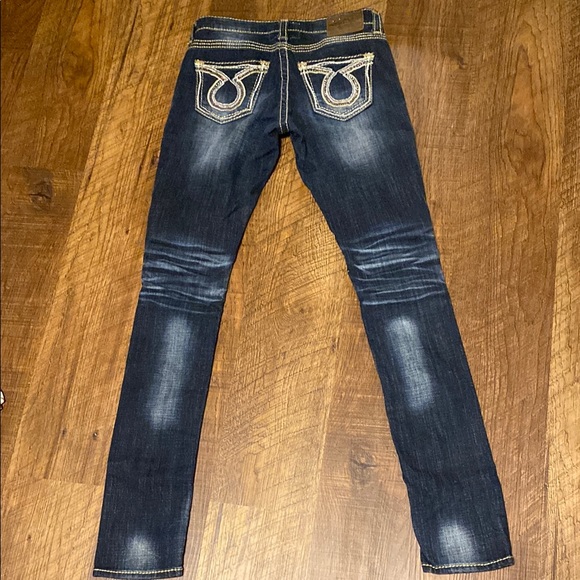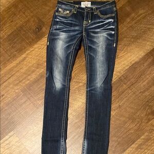 Stylish dark wash jeans. Features signature back pocket design. Perfect for casual wear.
