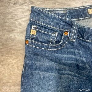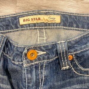 Authentic Big Star “Casey” low-rise bootcut jeans in a dark wash with detailed white embroidery and button flap back pockets. Size 28 Regular with stretch for a flattering, comfortable fit.