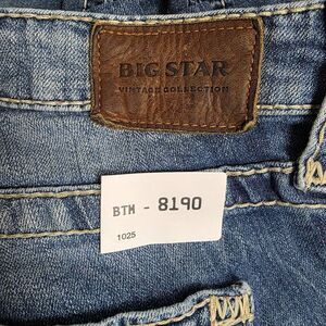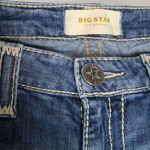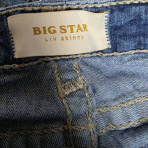 Pre-owned Big Star “Liv” Skinny women’s jeans, size 28R. Medium wash distressed denim with whiskering, fading, and ripped front details. Features contrast stitching, embroidered back pockets, zip fly, and button closure. Made in Mexico from 99% cotton and 1% spandex for a soft stretch fit. Approx. measurements: waist 14.25” flat, rise 8”, inseam 30”, leg opening 5.5”. Great used condition—light wear consistent with distressing, no major flaws.