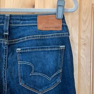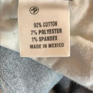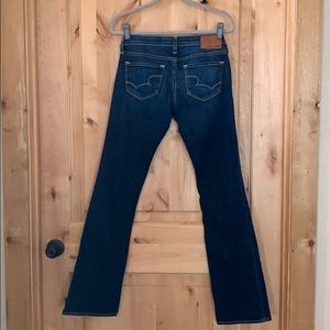 Dark denim, light weight, 32.5” inseam, 40” front of jeans to bottom of the leg. 42” from top of back to bottom of leg.