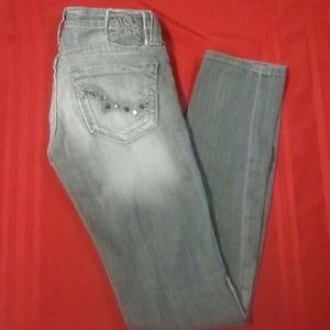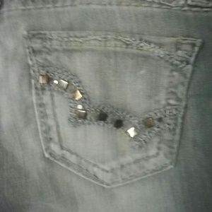 Light grey faded front thigh area and back button area. Super comfy, Light-weight materials makes you feel as if you are wearing cotton. Very cute. Back pockets have dark grey metallic pieces.