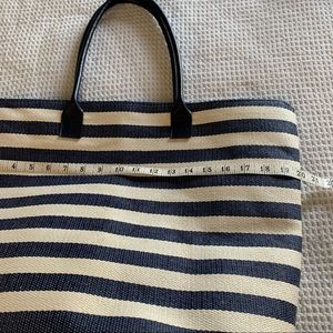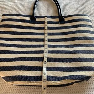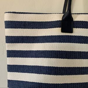 Light weight lined vinyl bag great for beach or carrying bulky items. Lined with one inside pocket for phone or keys. Navy & cream stripes. Open top. Two navy vinyl handles. Never used. In perfect condition.