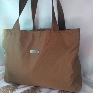 Big Beautiful Baggallini bag. Brown with light blue interior. Interior has some yellowing discoloration around zippers and slip pockets. Great condition otherwise. Lots of room. 3 sections.