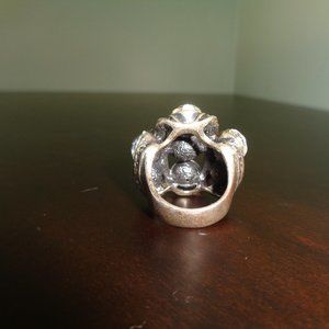 This is a nice ring with multi-colors crystals. It's in a fair condition: some tiny crystal in the frame are missing and there is signs of wear and tarnish. It's heavy, but looks good on the finger.