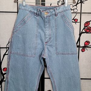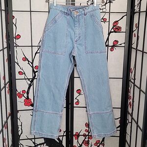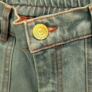 They are designed, cut, sewn, and pre-shrunk in Los Angeles using American-milled 10oz, non-stretch, 100% cotton denim. Key features include unisex sizing, an elastic waist in the back, a straight leg, a signature key loop, a hammer loop, and a gold Sun Baby Logo button enclosure.