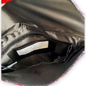 Style: deep purple snakeskin print and multicolor sequin large clutch purse, magnetic snap closure, black satin lining with slit pocket, removable gunmetal chain strap