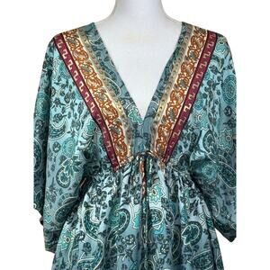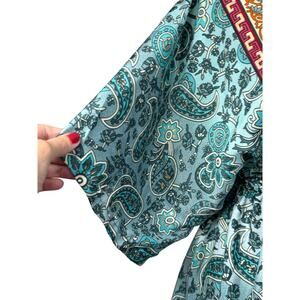 Turquoise paisley print accented with ethnic inspired border in rust, maroon, and gold