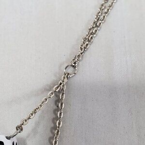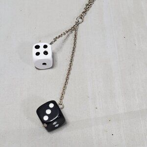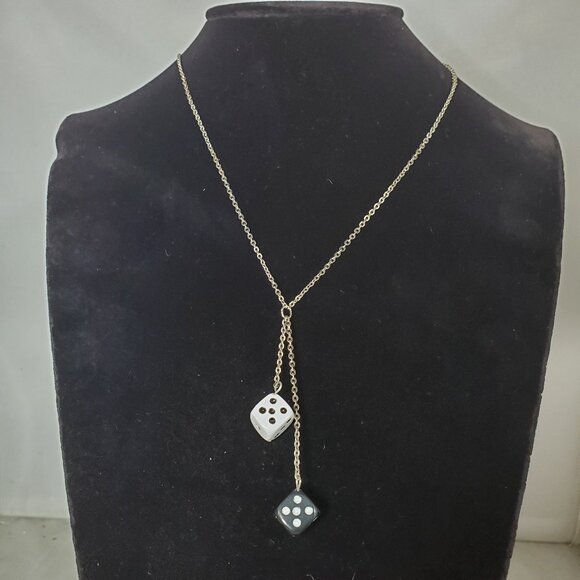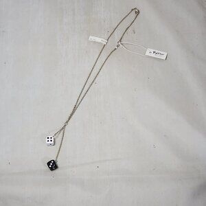 Bijou necklace features a playful design with a silver-toned chain that splits to suspend two dice pendants, one white and one black, creating a stylish "Y" necklace or lariat style.