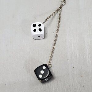 Dice Design: There is one white die with black dots and one black die with white dots, both showing the standard number patterns. They appear to be solid, possibly made of resin or a similar material.