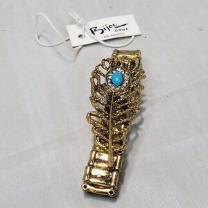 Bijou Vintage Gold Tone Stretch Ring with Feather and Turquoise Accent: