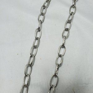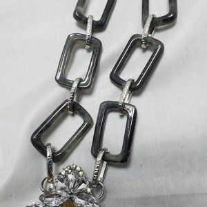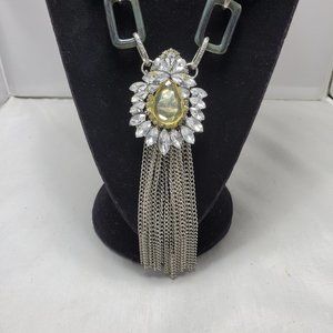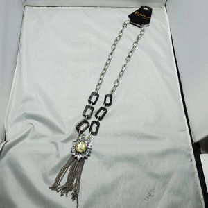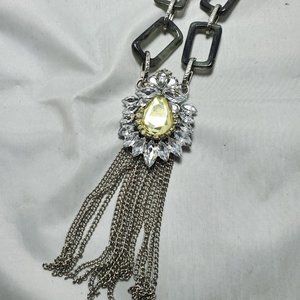 Bijou long silver link necklace with medallion & rhinestones & fringes