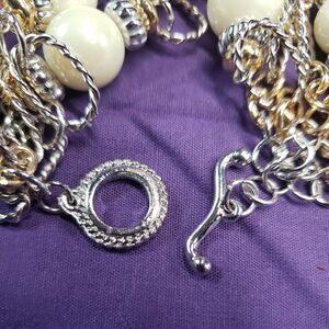 Bijoux Stella Multistrand Mixed Metals Faux Pearl Bracelet, NWT. This is a very beautiful mixed metals 5 layer chain bracelet. It has gold and silver tone metal, and two sizes of ivory colored faux pearls that are either a good quality coated acrylic or glass. It weighs 1.7 ounces. Ot is right at 8.5 inches long. New in package.