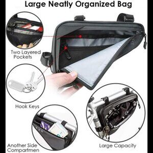🧿Well Organized Pockets --- With dimension of 8.9*6.1*2.2 inch (L*W*H), the bike storage bag has 1.5L large capacity. The left zipper slot perfect for cards and cash, and the right big compartment is easy to hold daily essentials such as mobile phone, power bank, gloves, sunglasses, flashlight, mini bike pump, bike repair tools and other accessories. The 2 interior layered pockets and key hooker help to organize the belongings.