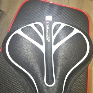 Comfortable bike seat cover with ergonomic design for better support. White accent lines have slight fading from normal use (see photos), but padding and structure are in excellent condition. Perfect for indoor cycling or outdoor rides