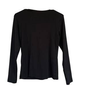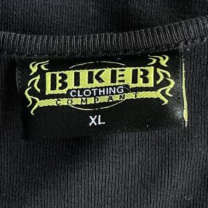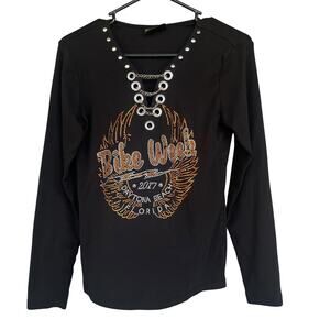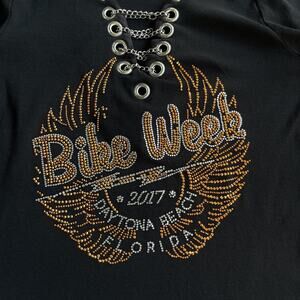 Features a black long sleeve design with eye-catching orange and clear rhinestone embellishment forming "Bike Week Daytona Beach Florida 2017" surrounded by flame graphics on the front. Deep V-neck with large metal grommets and two silver chain lace-up details. Stretchy, soft knit fabric for comfort. Back is solid black with no design or embellishment. Tag reads Biker Clothing Company XL.