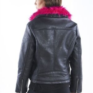 faux leather asymmetrical Biker jacket with pink detachable collar and ultra soft faux fur lining
