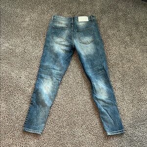 Men's blue distressed biker jeans with patchwork design