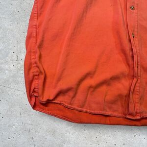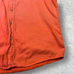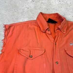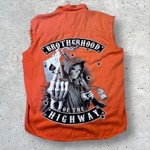 The Biker Wear Sleeveless Shirt in 2XL is a solid orange button-up shirt made of cotton denim. It features a collared neckline, button closure, and a regular fit. Perfect for casual occasions in the summer or spring, this shirt has a biker theme with accents like pockets and a button-down collar style.