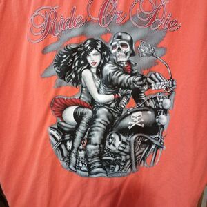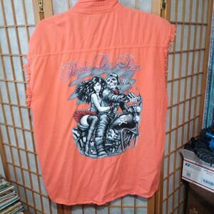 Bold Biker Wear USA Orange Sleeveless Denim featuring Ride or Die graphics. Grim Reaper and Pinup Girl on Motorcycle. This 3XL button-up sleeveless top delivers classic biker style with durable denim construction, making it perfect for motorcycle enthusiasts, hot rod fans, or collectors of vintage biker gear.