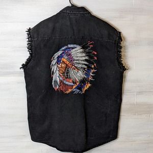 Bikerwear Men's Black Frayed Sleeve Native American Emblem Button Up Shirt Sz XL