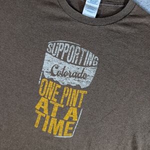 Casual brown tee with Suppoting Colorado One Pint at a Time print.