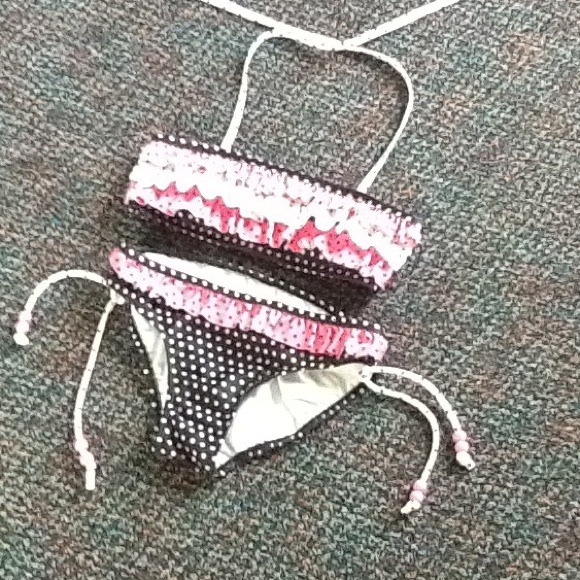 This is a black, white, and pink bikini. It has tassels and beads on the bottoms!