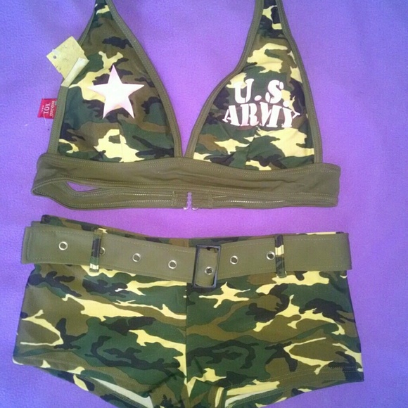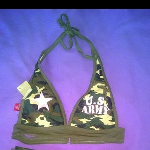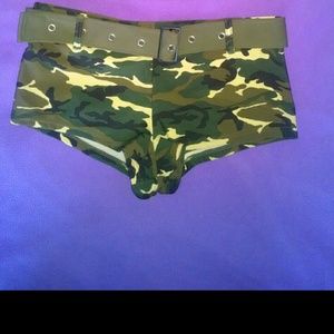 Bikini top with boy shorts. Padded bra and detachable belt. Sold together.