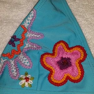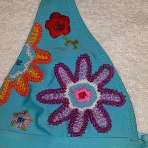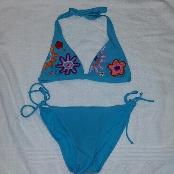 Bikini blue with crocheted flowers on the top worn a few times really pretty on. Cut the tag out of the bottom not out of the top.