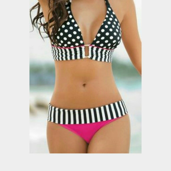 Hot pink with black stripes on bottoms top is black with polka dots. Will also fit a medium