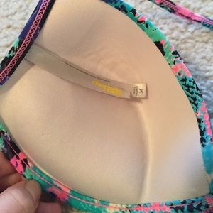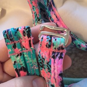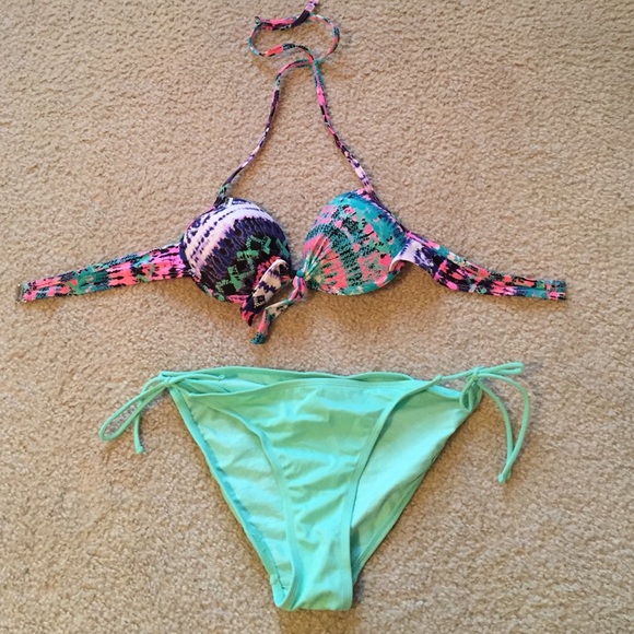 Neon splatter print bikini top with aqua color bottoms. Top size medium with great push-up. Bottoms size large with adjustable ties. No known defects. PET FREE SMOKE FREE HOME. I accept offers.