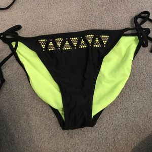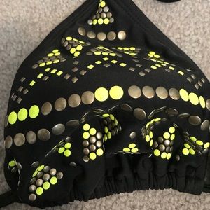 Florescent green/black/gray bikini. Top is padded with adjustable straps. TOP IS SIZE XL, BOTTOM IS SIZE M