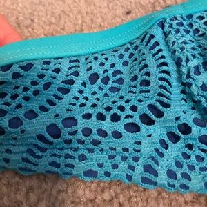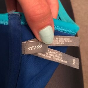 Dark blue aerie bikini set with light blue patterned material on top. Padded with underwire. TOP IS SIZE 34D BOTTOM IS SIZE M
