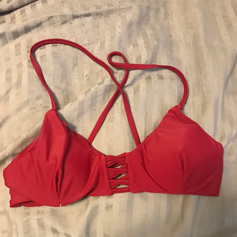 Bikini is darker than the picture shows. More burgundy. Size small. Never worn. Bottom are a bit cheeky. Straps not adjustable.