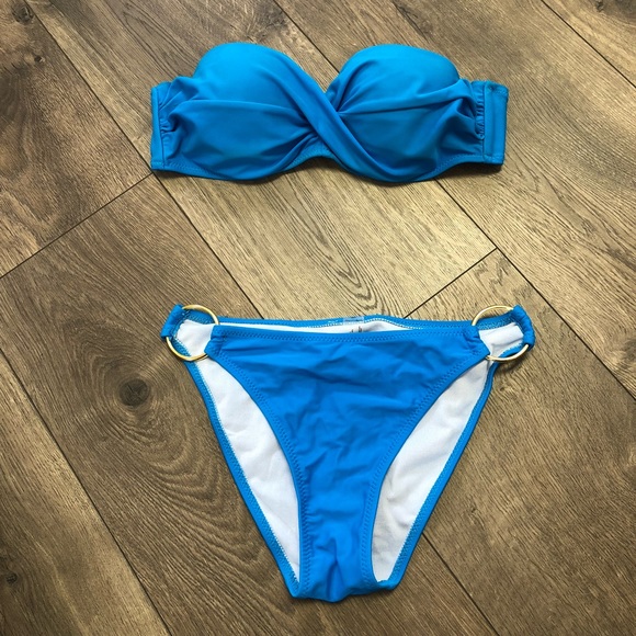 This royal blue strapless top comes with matching bottoms with a metal ring detail on the sides.