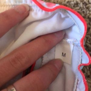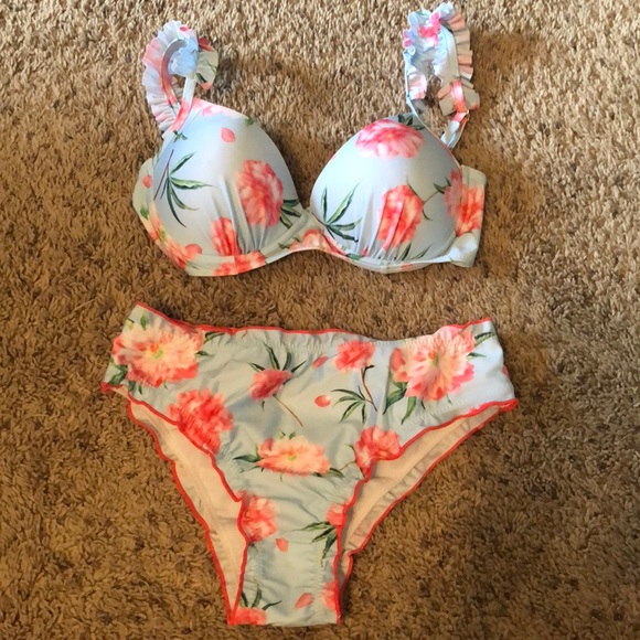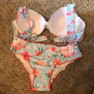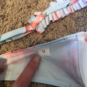 NEVER WORN! Beautiful bikini with ruffle sleeves. Looks and fits just like a bra. The straps do adjust. The bottoms have little ruffles along the edges.