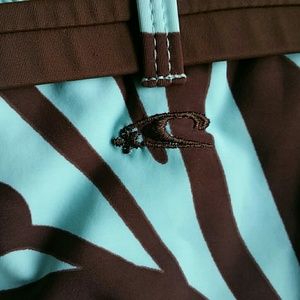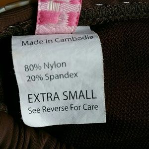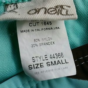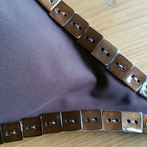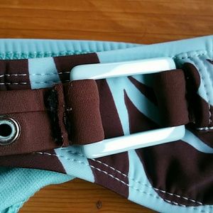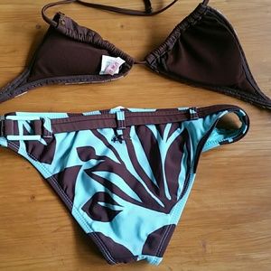 Bundled. Top and bottom are different brands but are of the same fabric and complimentary coloring. The top is extra small, the bottom is a size small. Softly padded bra top with shell like ornamental trim. Bottom with ornamental side buckle attached to decorative belt.